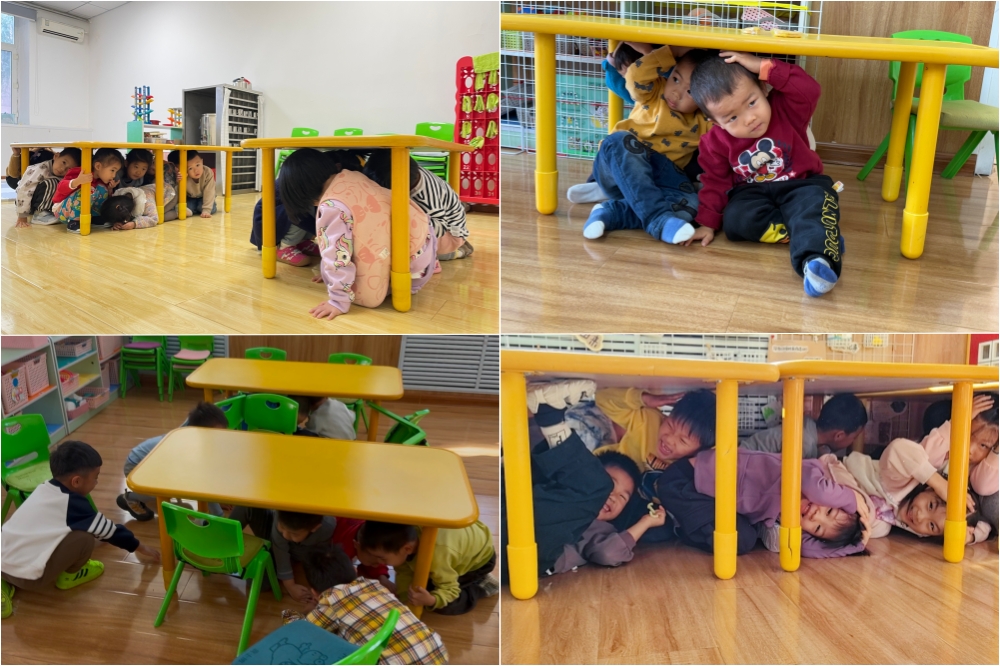 随着“地震来袭”的警报声响起,演练正式拉开帷幕。各班教师迅速反应,立即停止一切活动,沉着冷静地引导幼儿迅速就近躲避在坚固的桌下、墙角等安全区域,并用双手或软垫护住头部,整个过程紧张而有序。