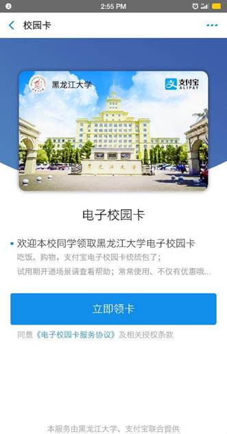 1.领卡。本校在职教职工和在校学生,拥有能正常使用的支付宝账号,即可轻松领取支付宝电子校园卡。