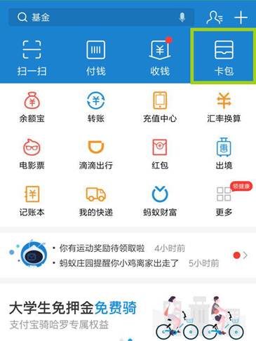 2.找卡。支付宝首页点击【 卡包 】,即可看到我的校园卡。