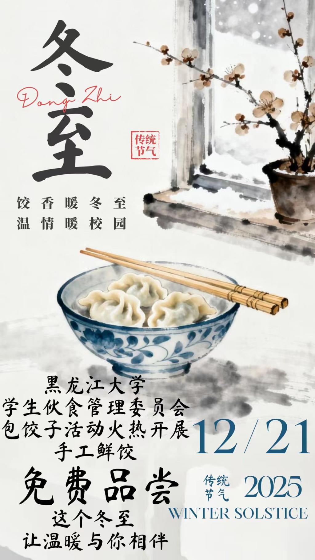 黑龙江大学学生伙食管理委员会组织包饺子主题活动,届时手工水饺免费品尝!数量有限,先到先得。快来感受冬日校园的温暖吧!